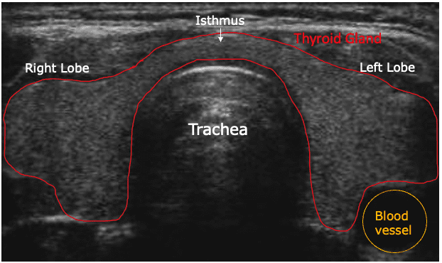Thyroid ultrasound is a sound wave picture of the thyroid gland taken by a hand-held instrument and translated to a 2-dimensional picture on a monitor. It is used in diagnosis of tumors, cysts or goiters of the thyroid, and is a painless, no-risk procedure.